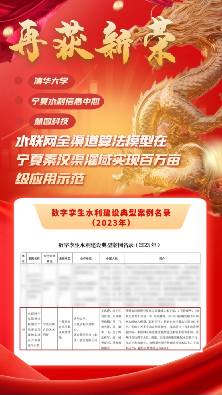 瑞雪兆有年,,,,,龙年好运至。。。。。。。。日前,,,,,水利部宣布“数字孪生水利建设典范案例名录(2023年)公示”,,,,,清华大学、宁夏水利信息中心与云顶国际vip.888慧图科技集团团结参建的课题项目“水联网全渠道算法模子在宁夏秦汉渠灌域实现百万亩级应用树模”入选水利部数字孪生水利建设典范案例名录,,,,,被评为典范案例。。。。。。。。