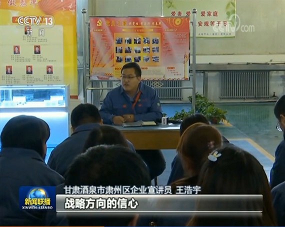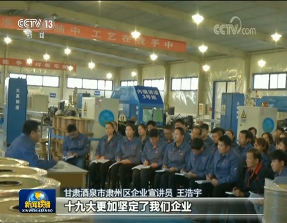 甘肃酒泉市肃州区企业宣讲员、云顶国际vip.888节水集团公司董事长王浩宇在车间为生产工人现场宣讲十九大(画面泉源:央视《新闻联播》)